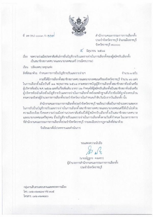 ประชาสัมพันธ์ การยื่นบัญชีรายรับและรายจ่ายในการเลือกตั้งของผู้สมัครรับเลือกตั้งเป็นสมาชิกสภาเทศบาลและนายกเทศมนตรี (กรณีครบวาระ)