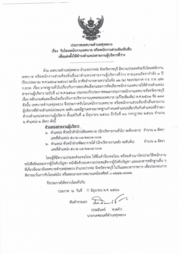 ประกาศรับโอนพนักงานเทศบาล หรือพนักงานส่วนท้องถิ่นอื่นเพื่อแต่งตั้งให้ดำรงตำแหน่งสายงานผู้บริหารที่ว่าง