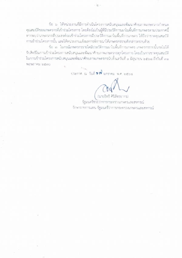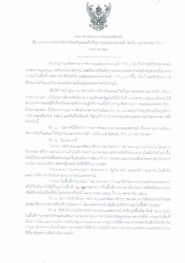 ประกาศกระทรวงเกษตรและสหกรณ์ เรื่อง มาตรการบริหารจัดการป้องกันและแก้ไขปัญหาฝุ่นละอองขนาดเล็ก ไม่เกิน 2.5 ไมครอน ( PM 2.5 ภาคการเกษตร)