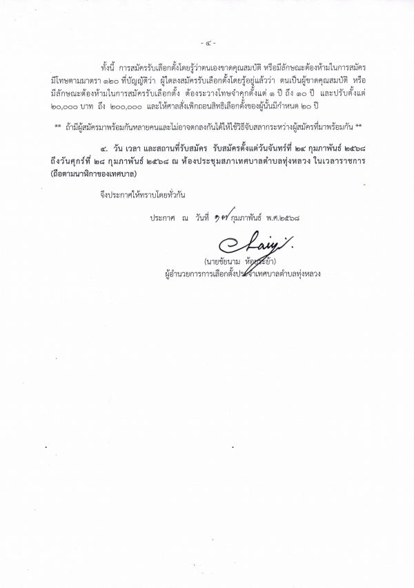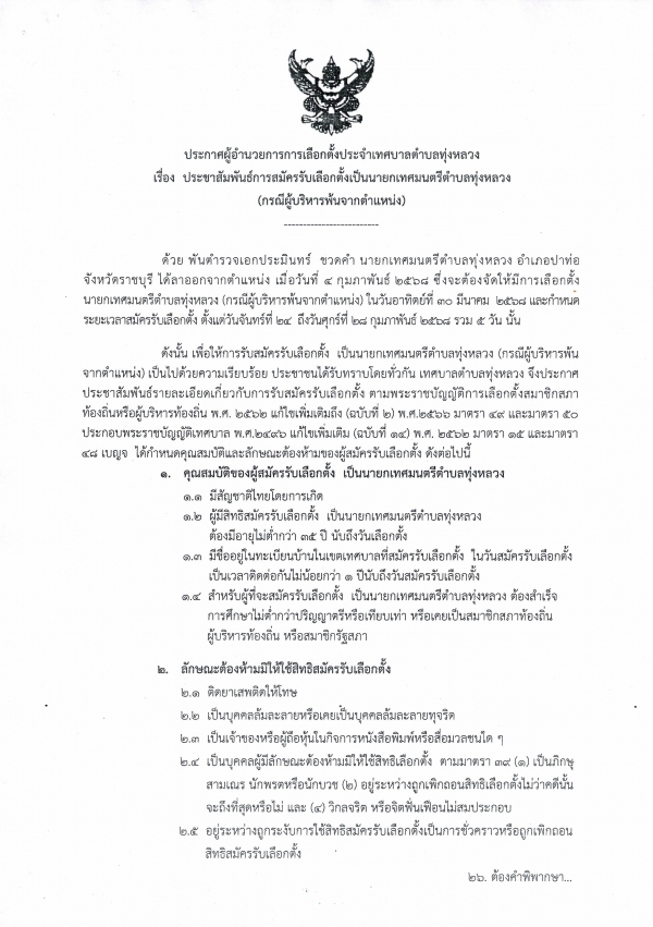 ประกาศผู้อำนวยการการเลือกตั้งประจำเทศบาลตำบลทุ่งหลวง อำเภอปากท่อ จังหวัดราชบุรี เรื่อง ประชาสัมพันธ์การรับสมัครรับเลือกตั้งเป็นนายกเทศมนตรีตำบลทุ่งหลวง (กรณีผู้บริหารพ้นจากตำแหน่ง)
